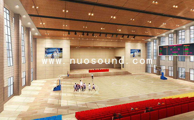 一般來說,多功能體育館建筑聲學設計的基本要求是要達到足夠的響度、滿意的清晰度、全場有比較均勻的效果以及無回聲干擾等物理缺陷,除了基本的設計之外,吸音材料的選擇也很重要。諾聲聲學向校方推薦的產品是諾聲體育館孔木吸音板